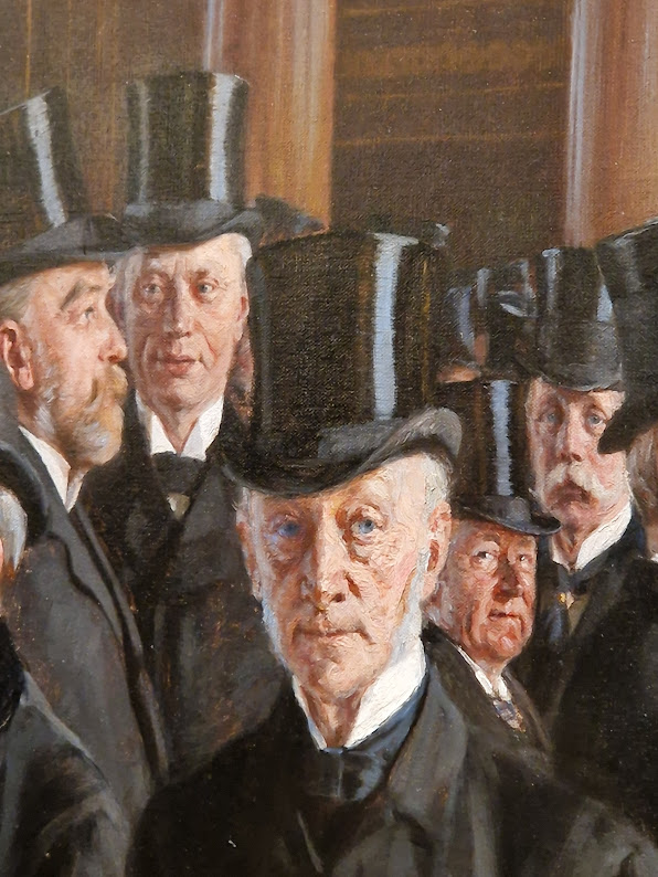 Det kostede at blive portrætteret: 500 kroner for forreste række – svarende til flere måneders leveomkostninger for en arbejderfamilie. Maleriet positionerede landets absolutte handelselite. Men værket kan læses som mere end et magtportræt. Hvem står ved siden af hvem – og hvorfor? Hvorfor bærer nogle bowlerhat og andre høj hat? I 1800-tallet var den høje hat et tydeligt statussymbol; at forlade hjemmet uden den, blev betragtet som upassende for en standsperson. Udtrykket “at være høj i hatten” stammer fra denne tidsperiode.